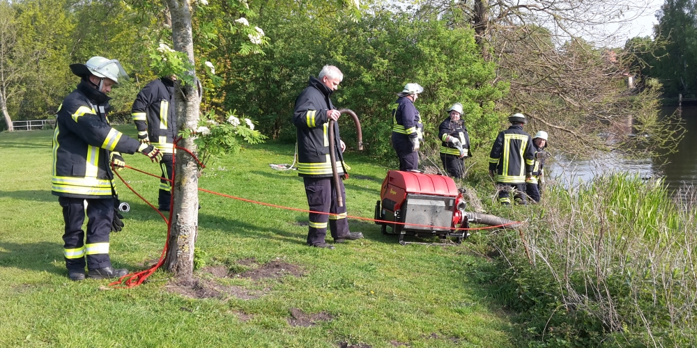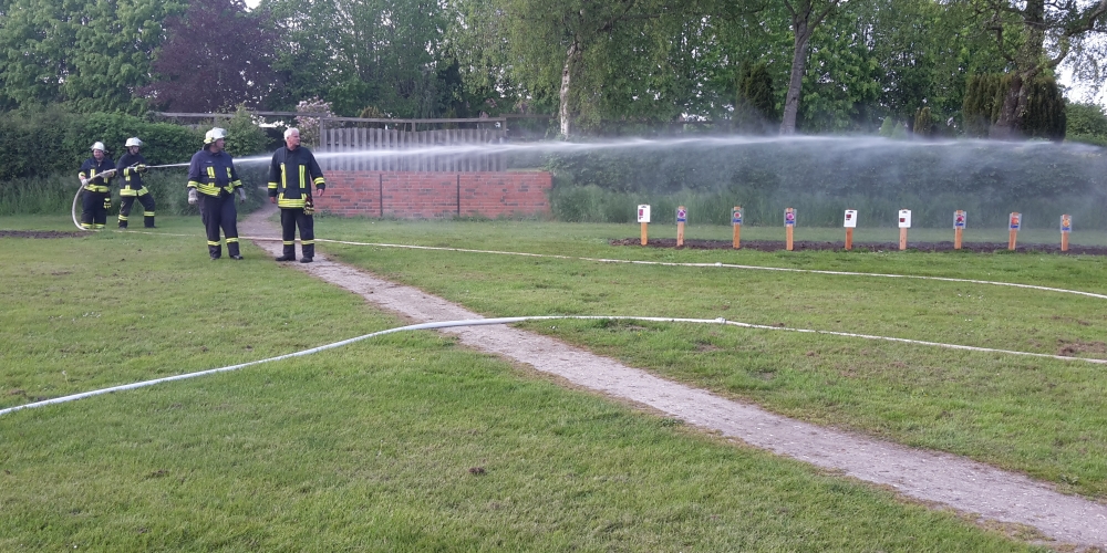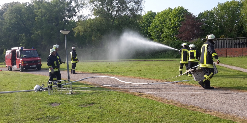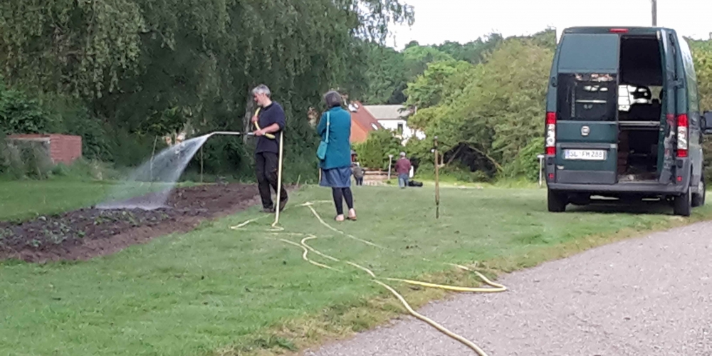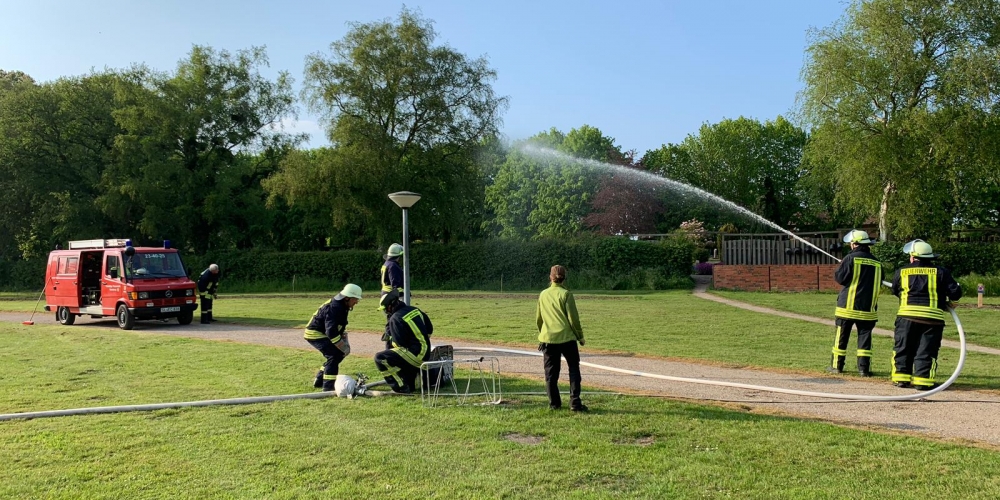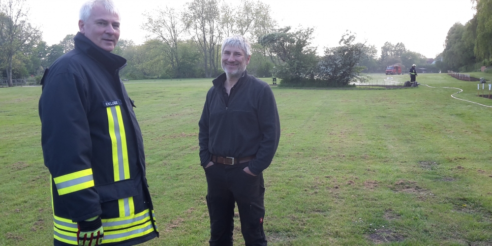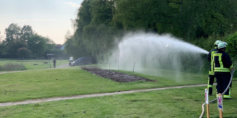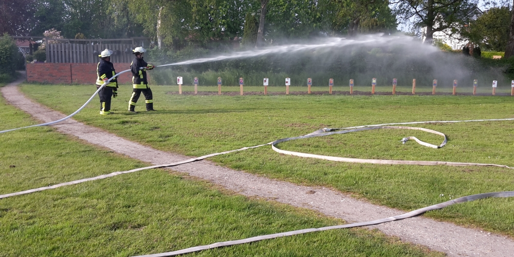 Die große Trockenheit im Boden ist ein ernstes Problem beim Anwachsen. Die Freiwillige Feuerwehr Stenderup nutzt die Gelegenheit für eine Feuerwehrübung und Wartung der Geräte. Sie hilft damit gleichzeitig maßgeblich beim Angießen, 18. Mai