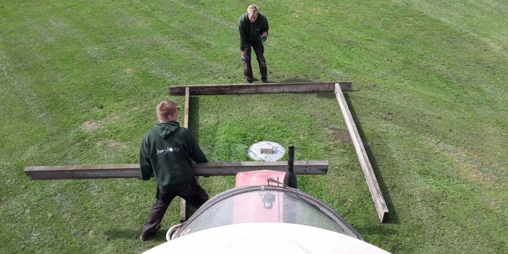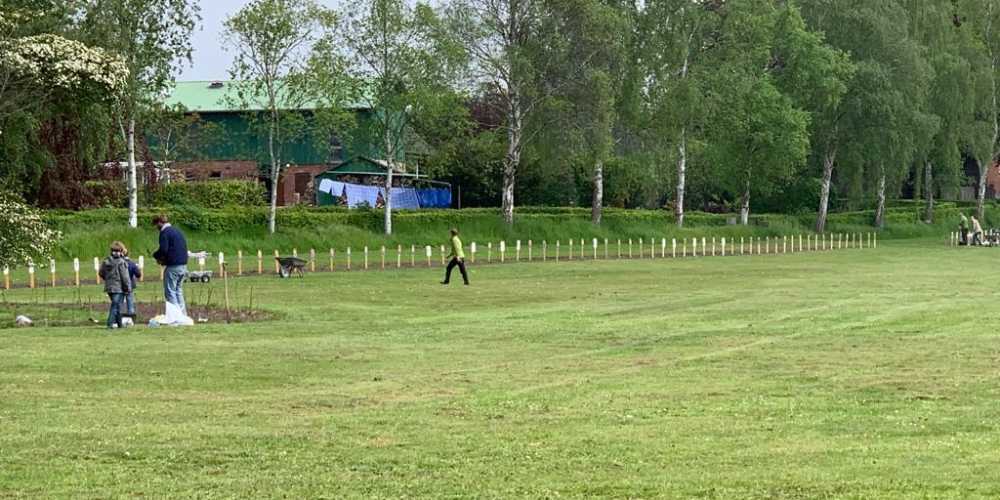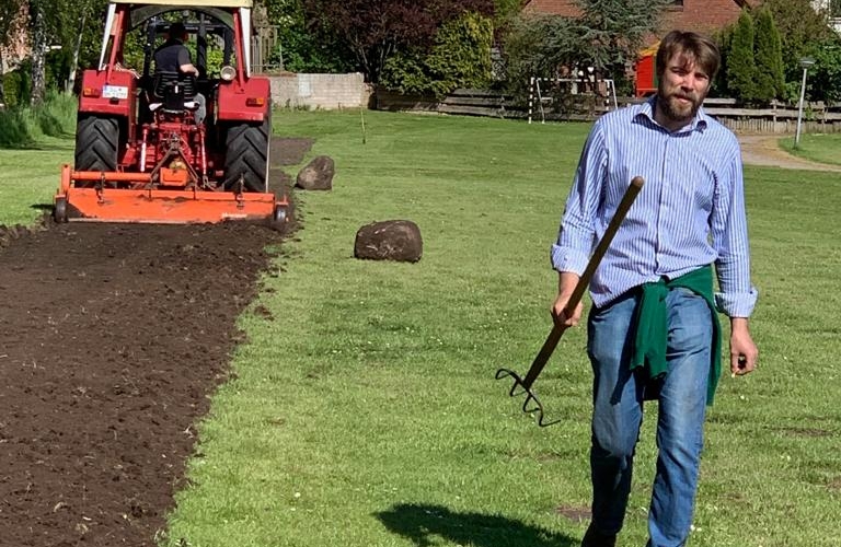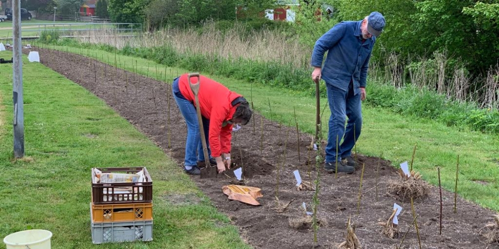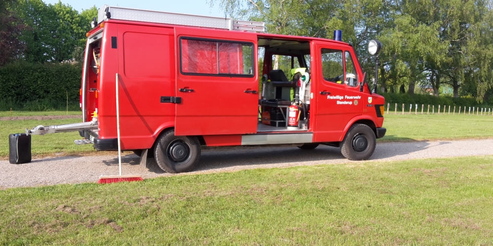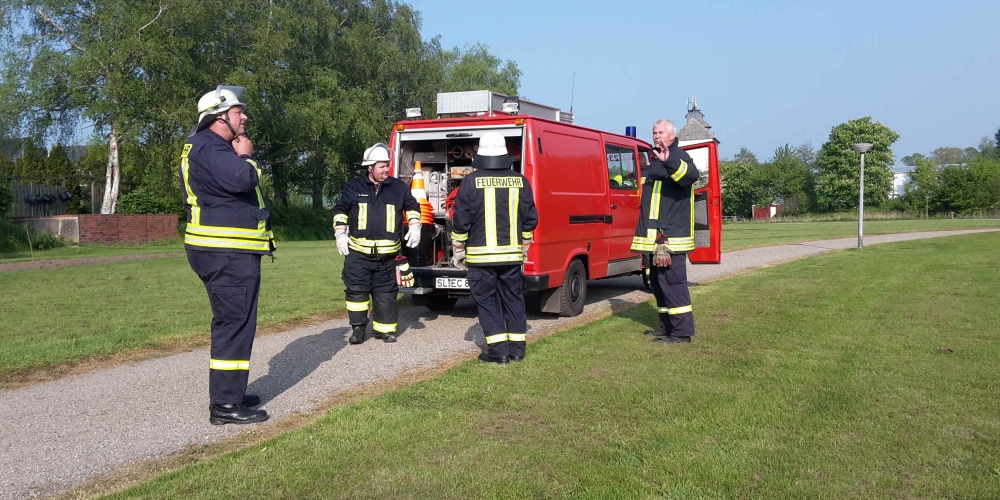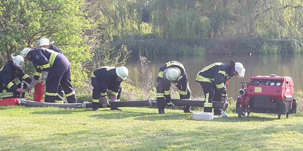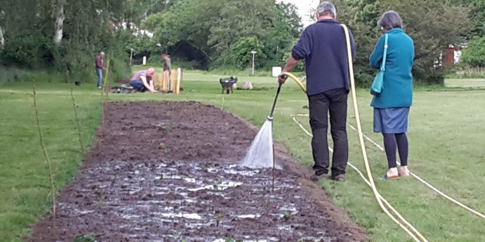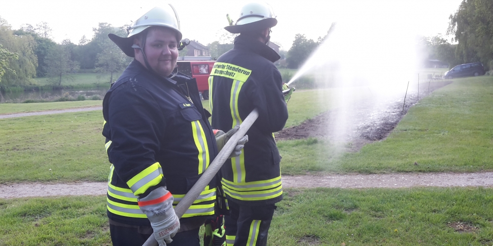 Die große Trockenheit im Boden ist ein ernstes Problem beim Anwachsen. Die Freiwillige Feuerwehr Stenderup nutzt die Gelegenheit für eine Feuerwehrübung und Wartung der Geräte. Sie hilft damit gleichzeitig maßgeblich beim Angießen, 18. Mai