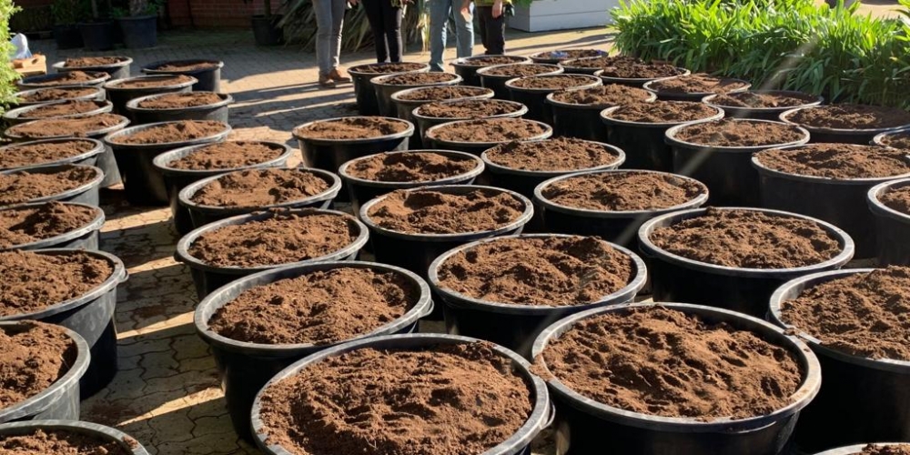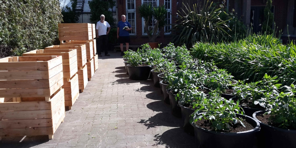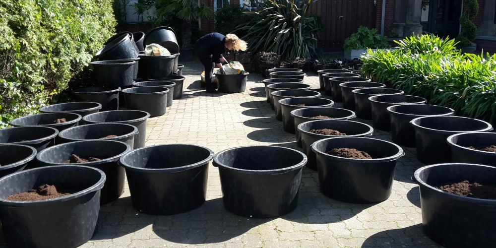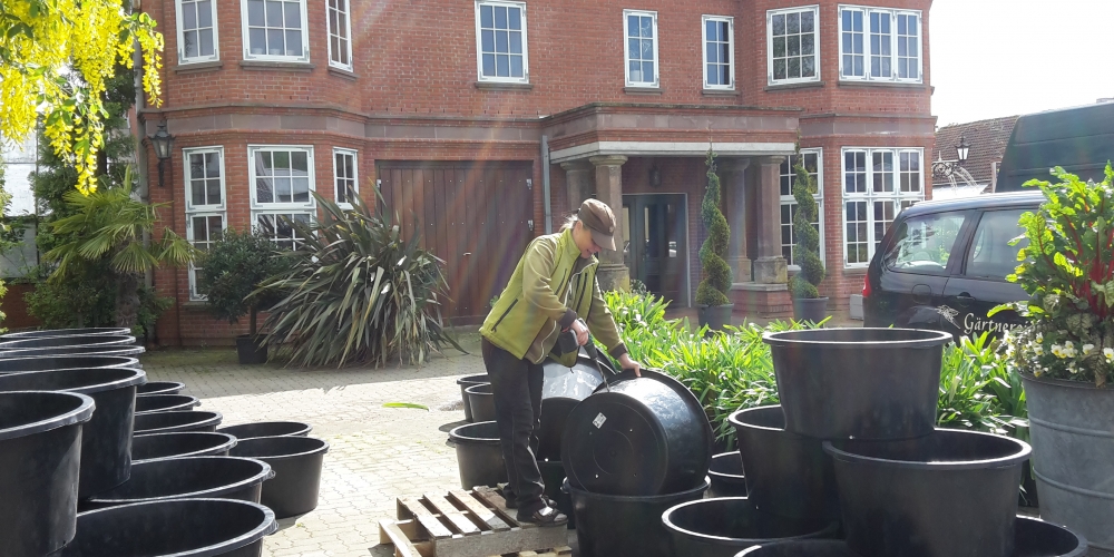 Die Planzkübel werden mit Löchern für den Wasserabfluß versehen und mit der gesponserten Erde von Einheitserdewerk Uetersen / Frux gefüllt, dann werden die Dahlien gepflanzt, 22. Mai