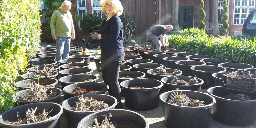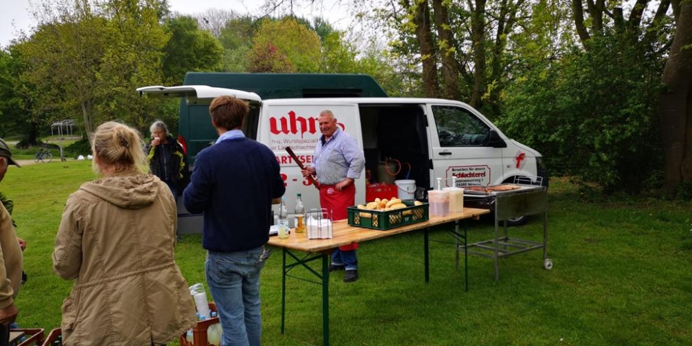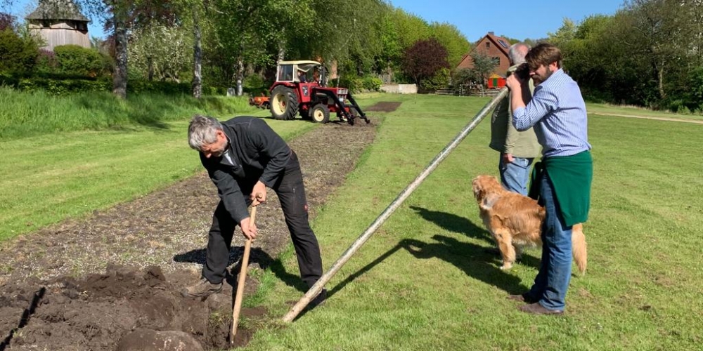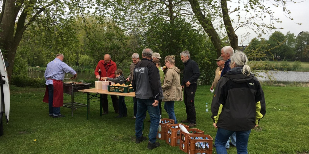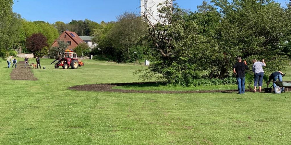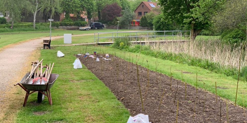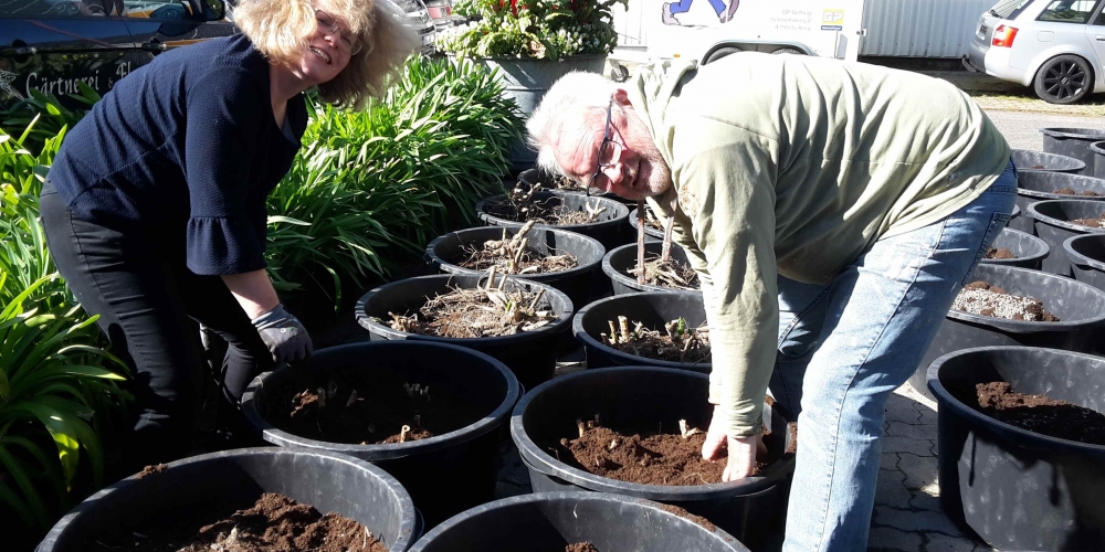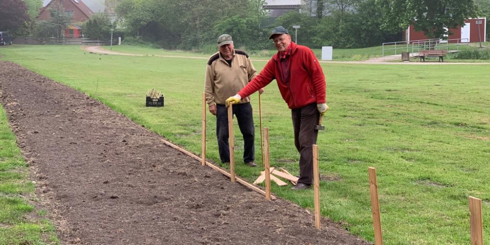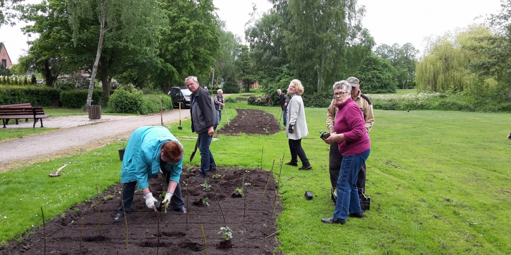 Die ersten Dahlien werden als Knollen im Bürgerpark gepflanzt . Nach dem fleißigen Graben gibt es Getränke und Gegrilltes, die Sponsoren sind: Getränkemarkt S. Führer und Schlachterei Bruhn.