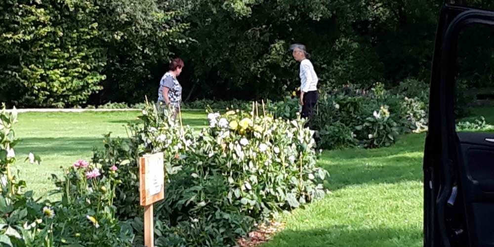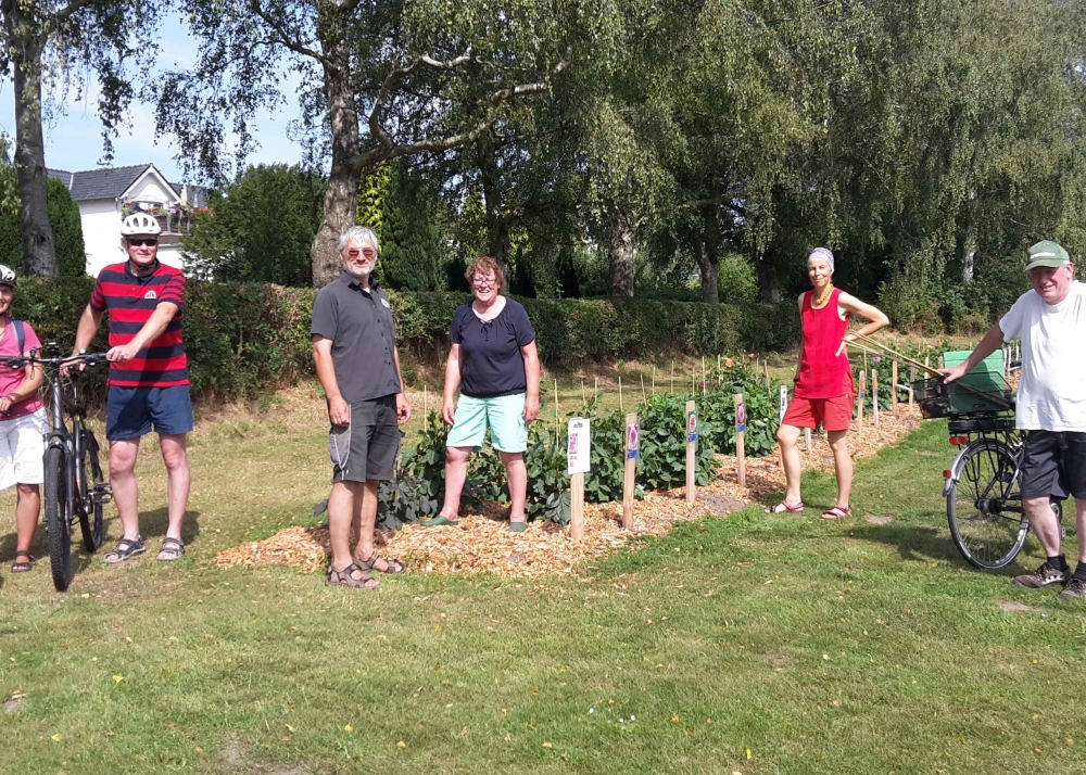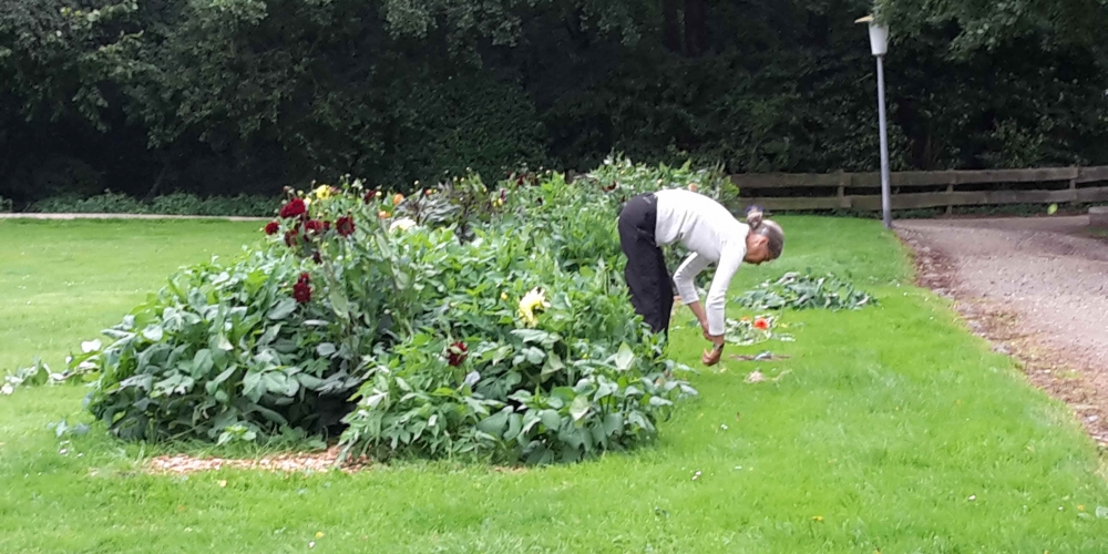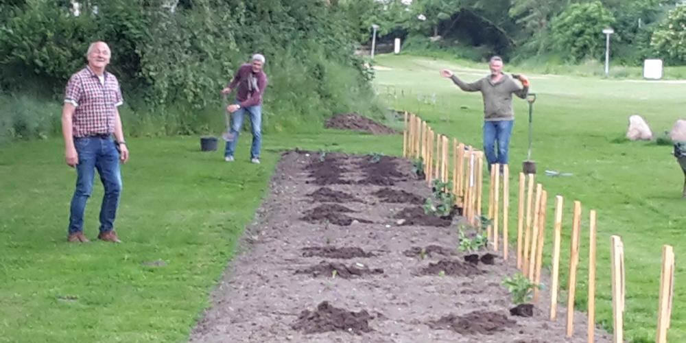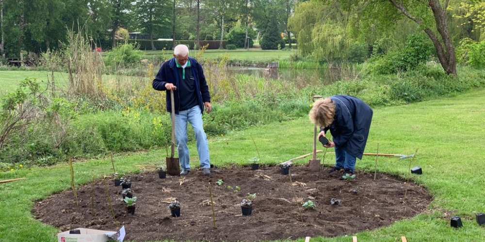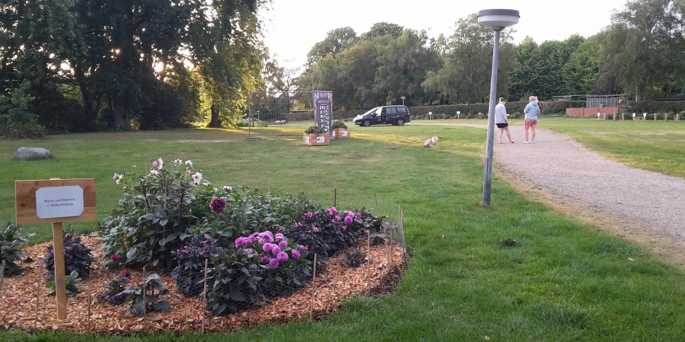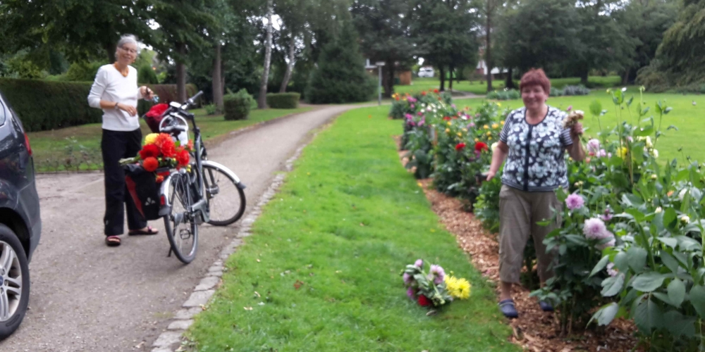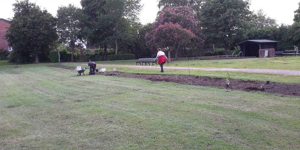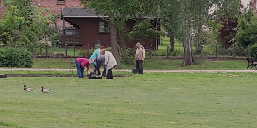 Das Pflanzteam ist zur Kontrolle im Bürgerpark und pflanzt die letzten Dahlien in entstandene Lücken. Die Kaninchen hatten da wohl mal probiert, 6. Juli