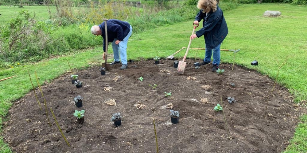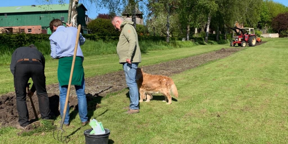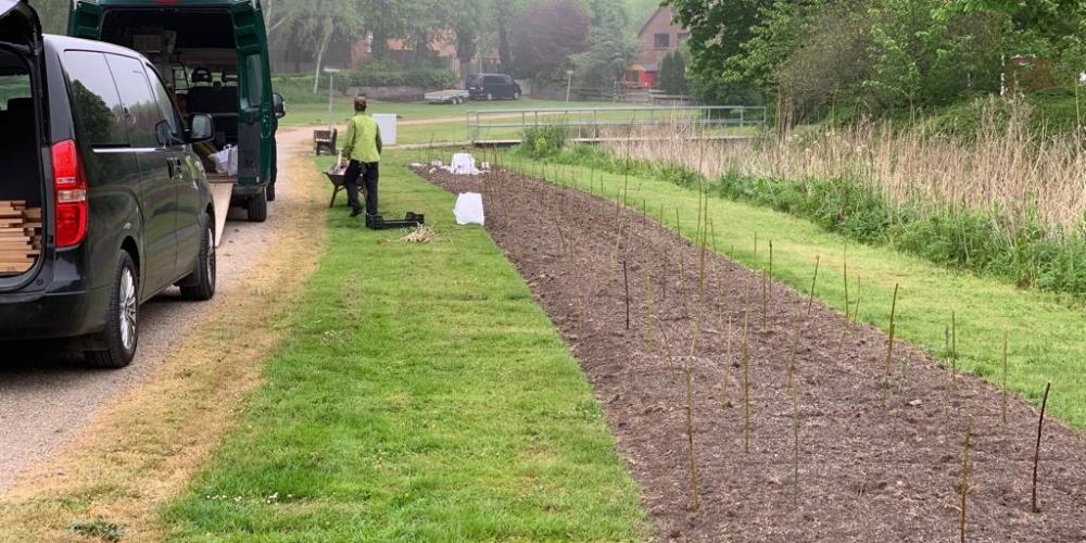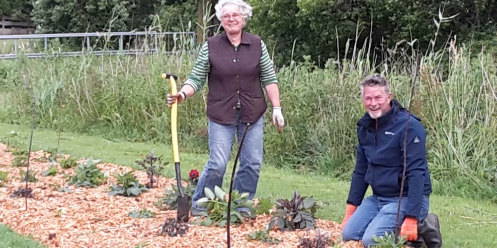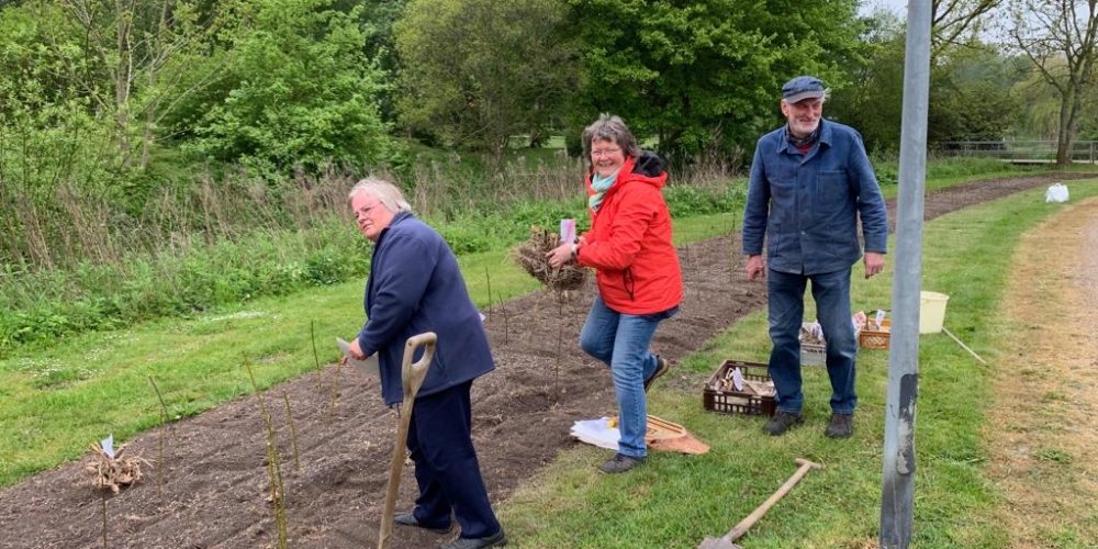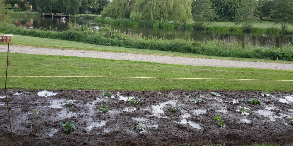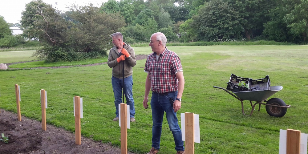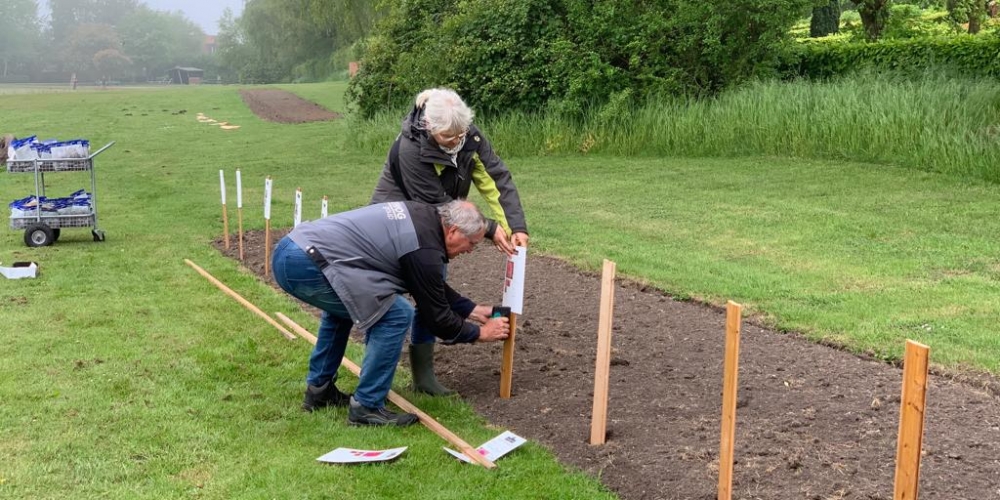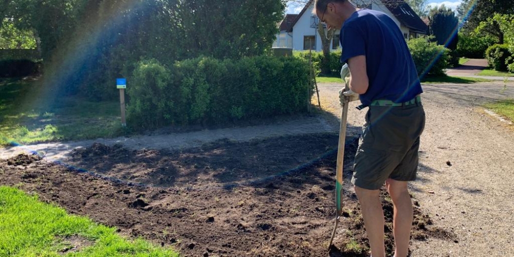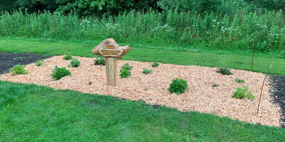 Das Pflanzteam ist zur Kontrolle im Bürgerpark und pflanzt die letzten Dahlien in entstandene Lücken. Die Kaninchen hatten da wohl mal probiert, 6. Juli