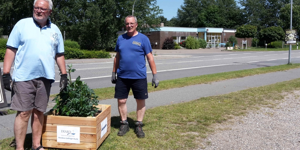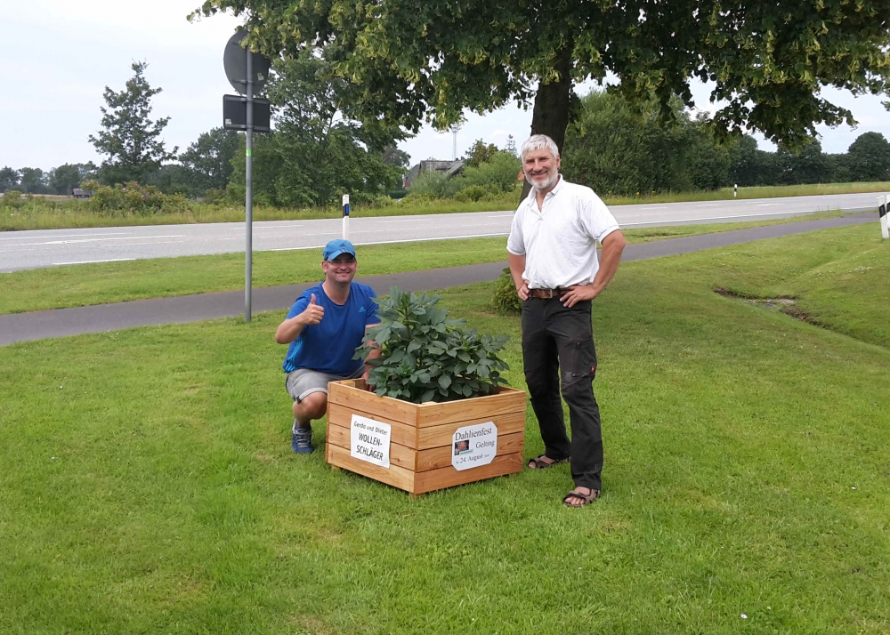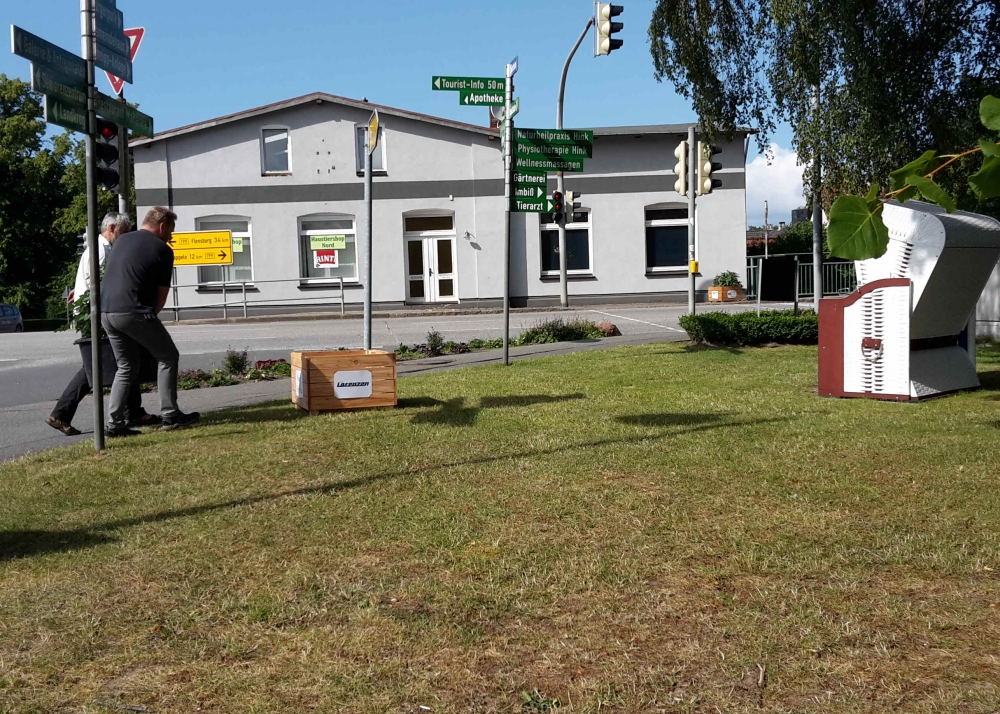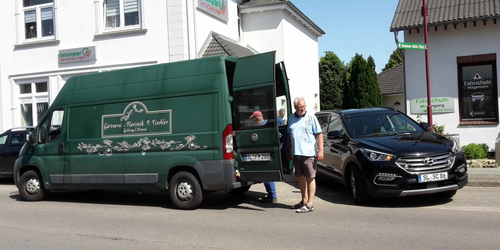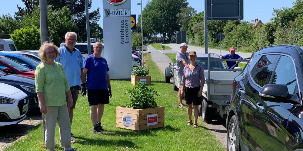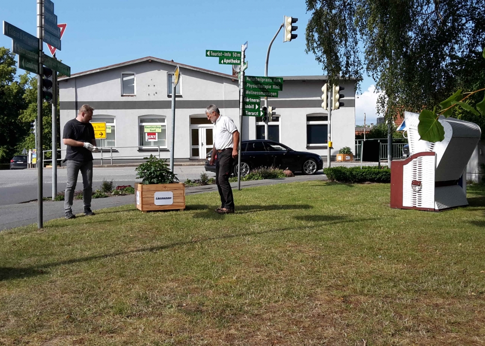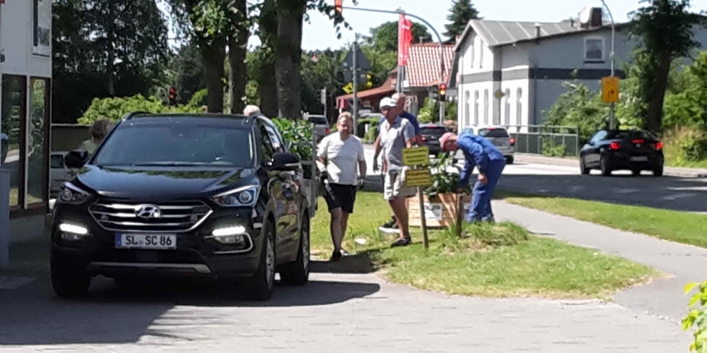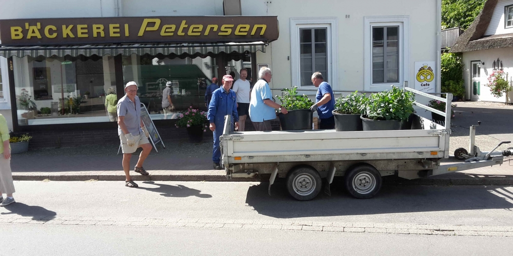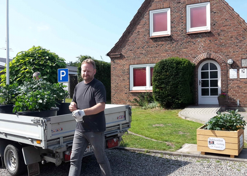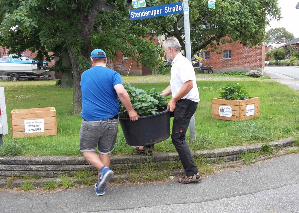 Die verbliebenen 30 Pflanzkübel werden im Süden Geltings platziert, sogar an der Mühle Charlotte, Grahlenstein, Stenderup, Hellert , Lehbeck und Wackerballig. Auch Bürgermeister Boris Kratz half tatkräftig mit, 13. Juli