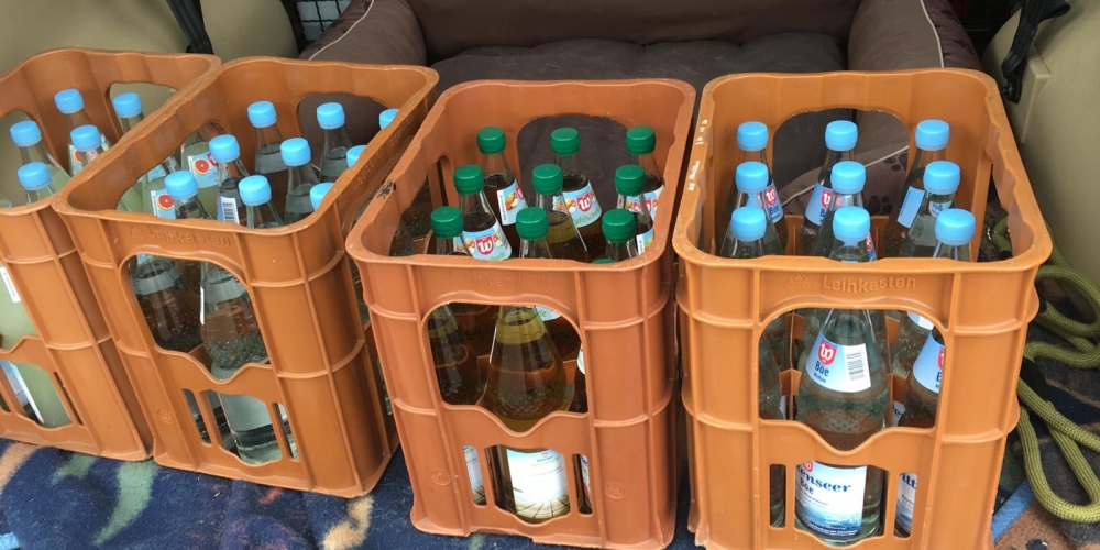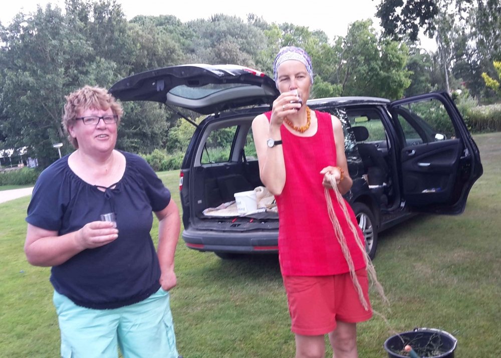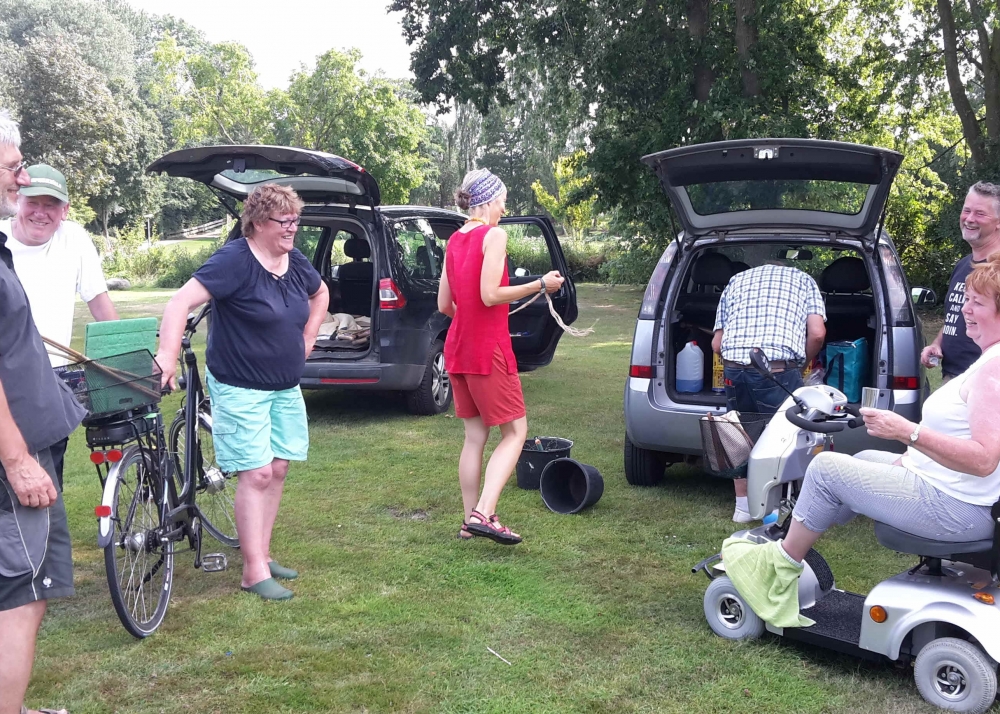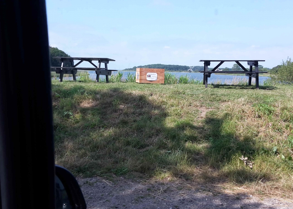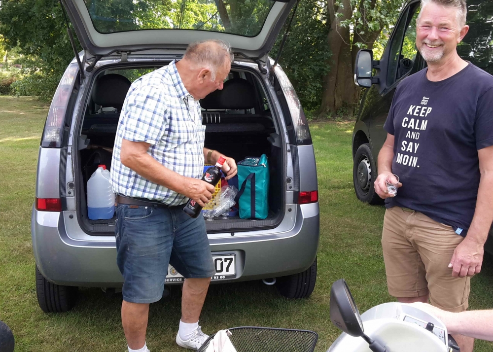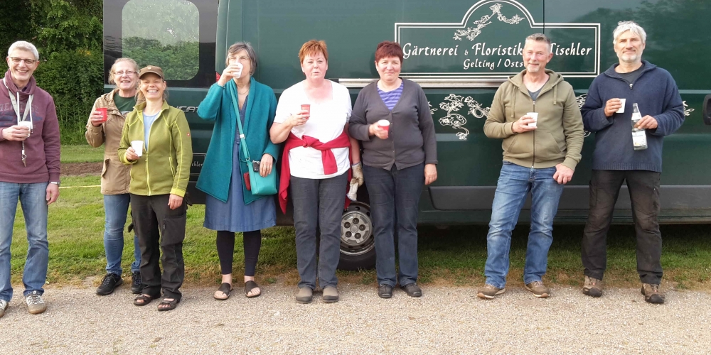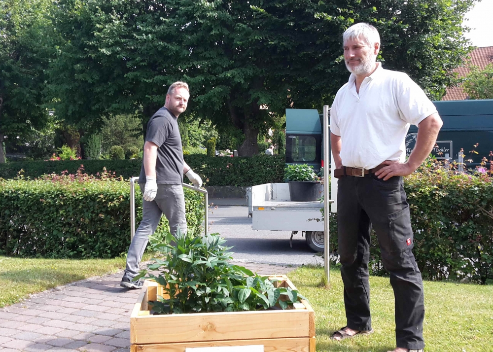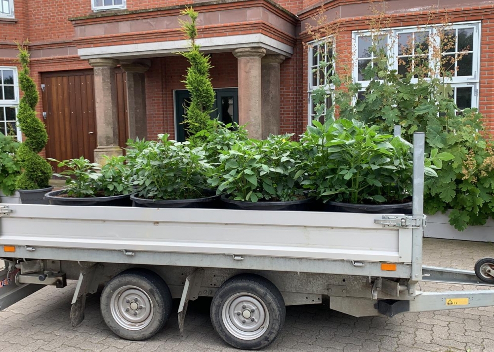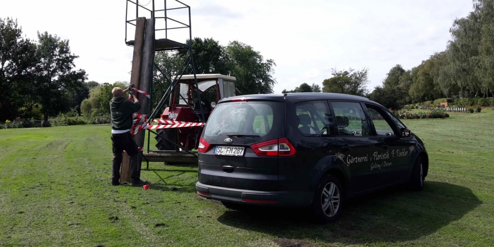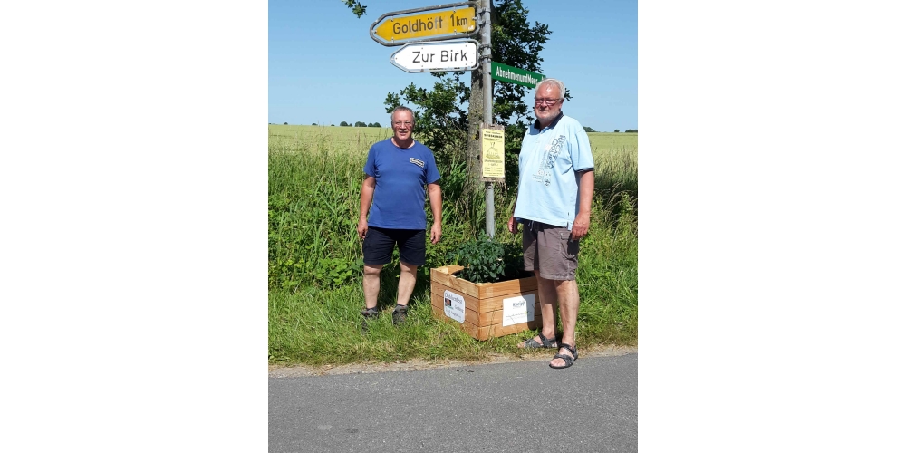 Die verbliebenen 30 Pflanzkübel werden im Süden Geltings platziert, sogar an der Mühle Charlotte, Grahlenstein, Stenderup, Hellert , Lehbeck und Wackerballig. Auch Bürgermeister Boris Kratz half tatkräftig mit, 13. Juli