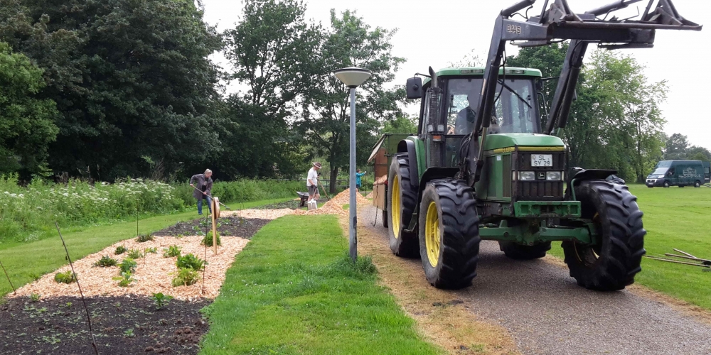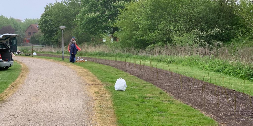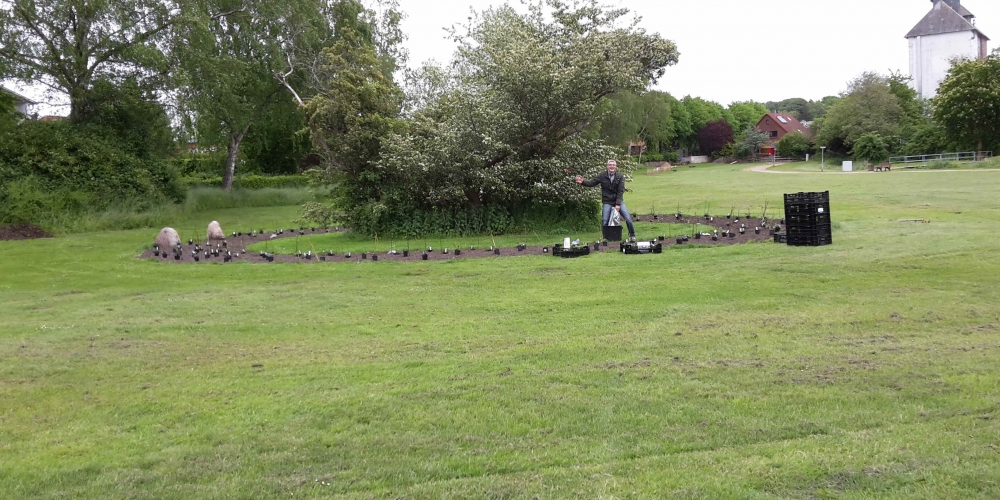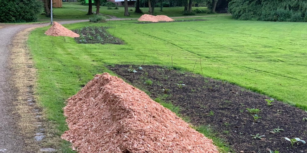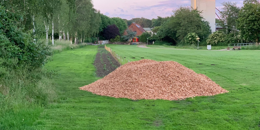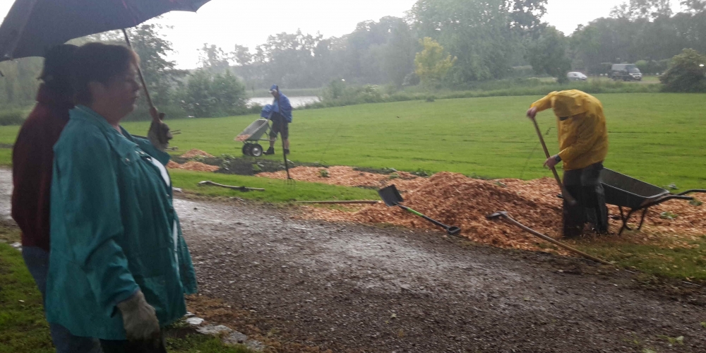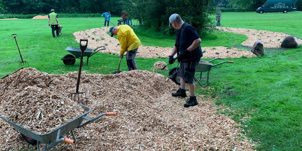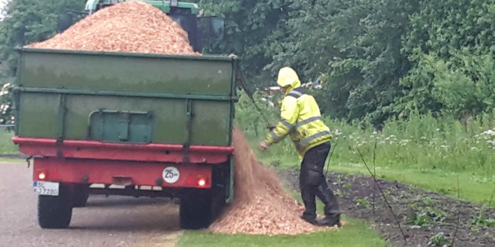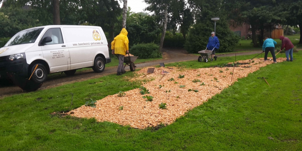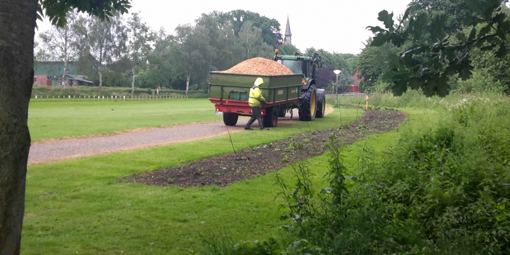 50 m3 Hackschnitzel werden auf den Beeten verteilt. Es dient dem Bodenklima, hält die Feuchtigkeit, belebt das Bodenleben und hält das Unkraut zurück. Es sieht phantastisch aus, super Material gesponsert von Lohnunternehmen Kai Jensen Basrott und den Kaffe und Kuchen und ein Dach bei Nieselregen sponserte Bäckerei C. Perersen. Aber alles wurde feritg. Das ist ein Super Pflanzteam, 14. Juni
