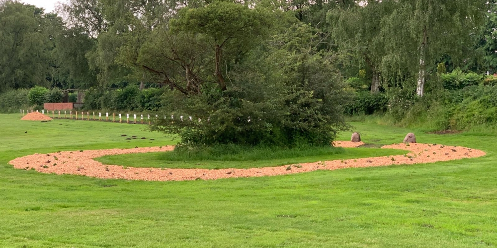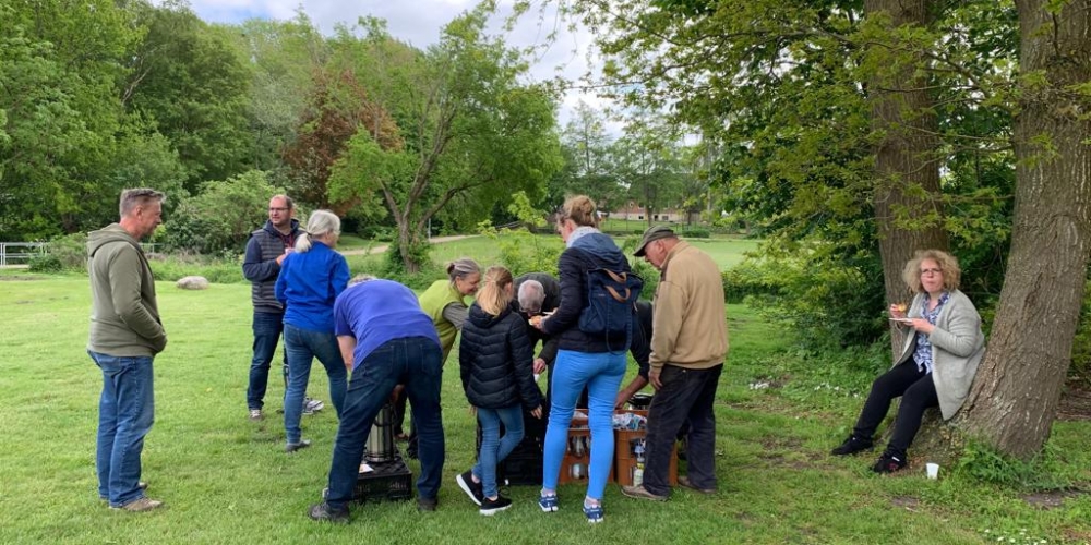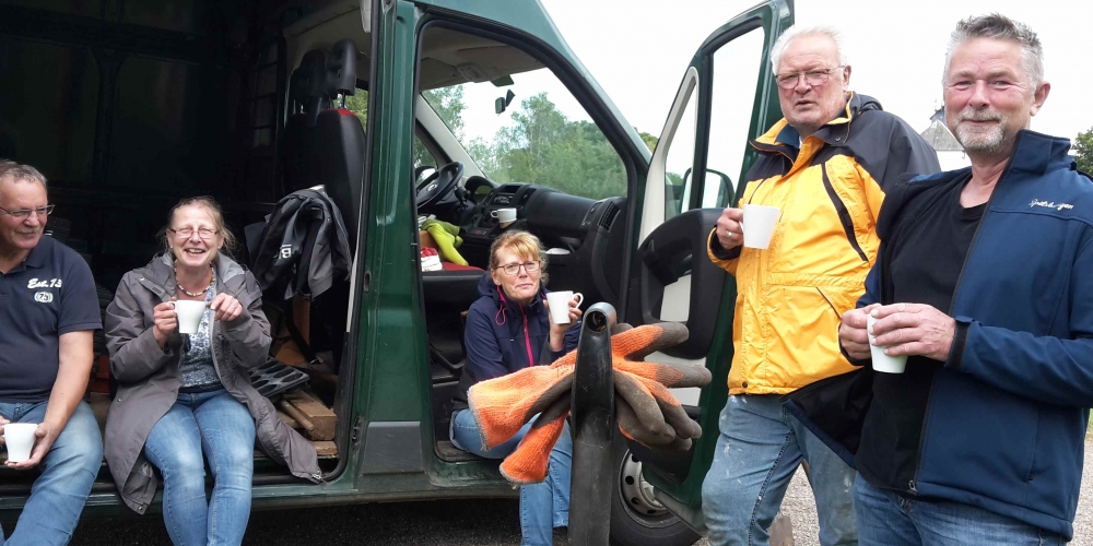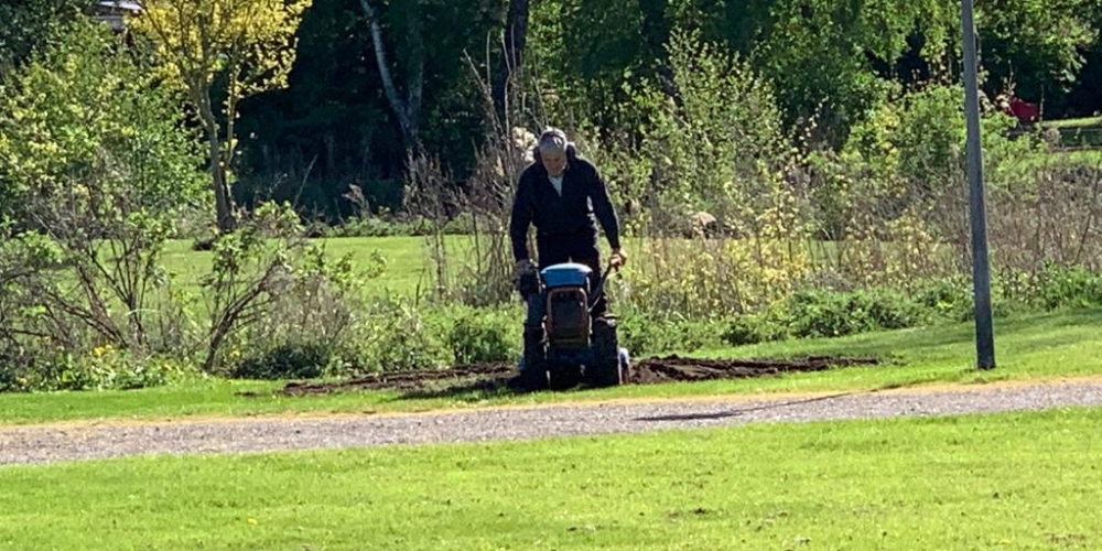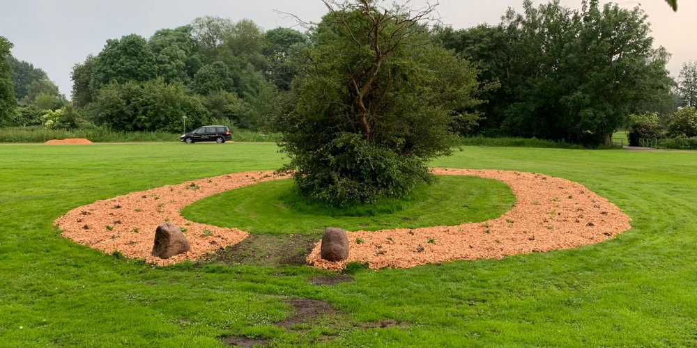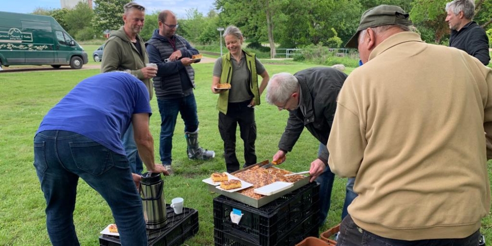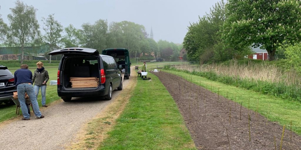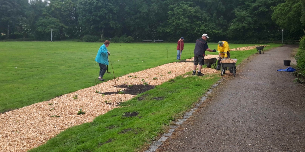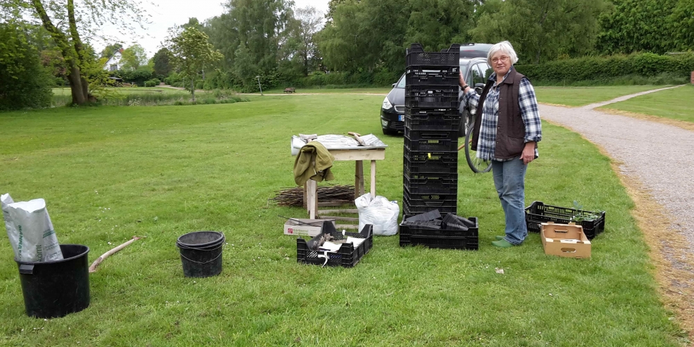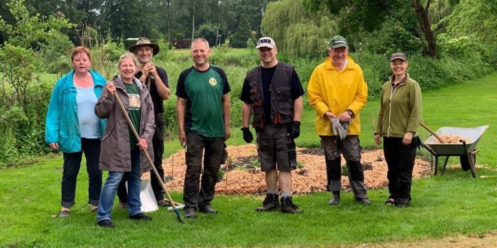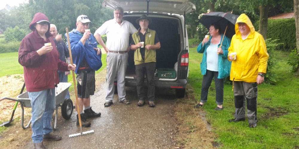 50 m3 Hackschnitzel werden auf den Beeten verteilt. Es dient dem Bodenklima, hält die Feuchtigkeit, belebt das Bodenleben und hält das Unkraut zurück. Es sieht phantastisch aus, super Material gesponsert von Lohnunternehmen Kai Jensen Basrott und den Kaffe und Kuchen und ein Dach bei Nieselregen sponserte Bäckerei C. Perersen. Aber alles wurde feritg. Das ist ein Super Pflanzteam, 14. Juni