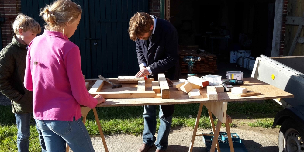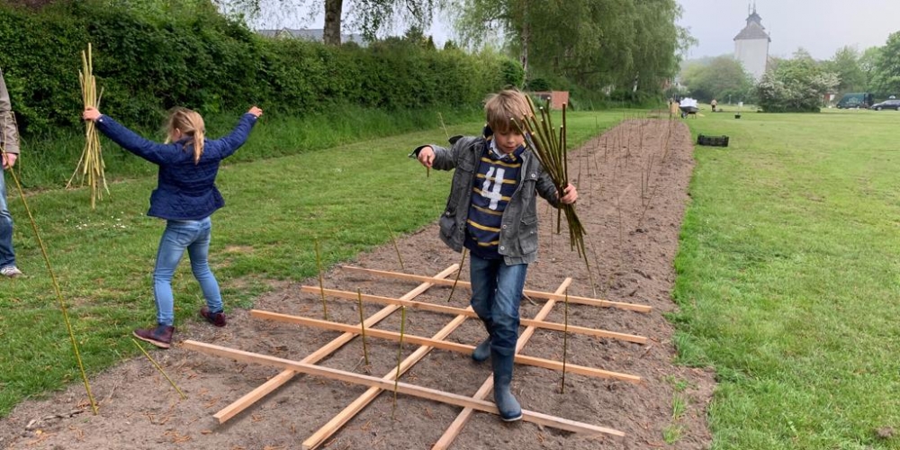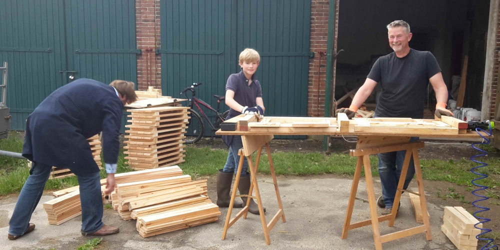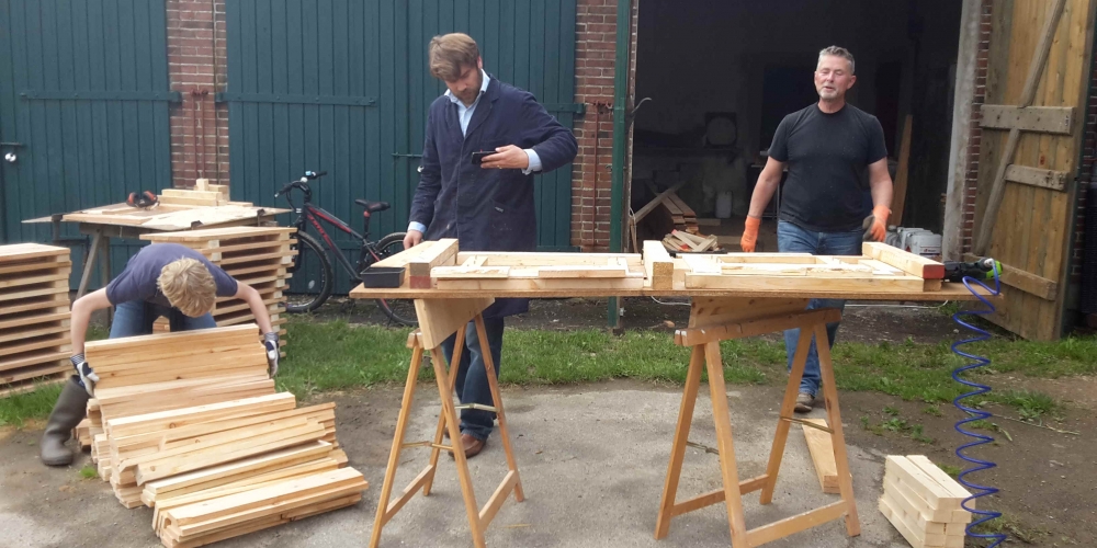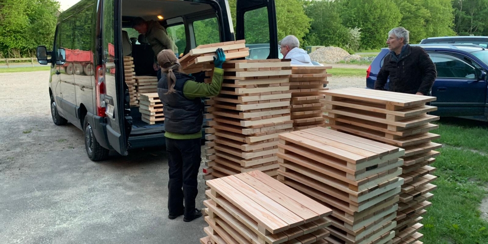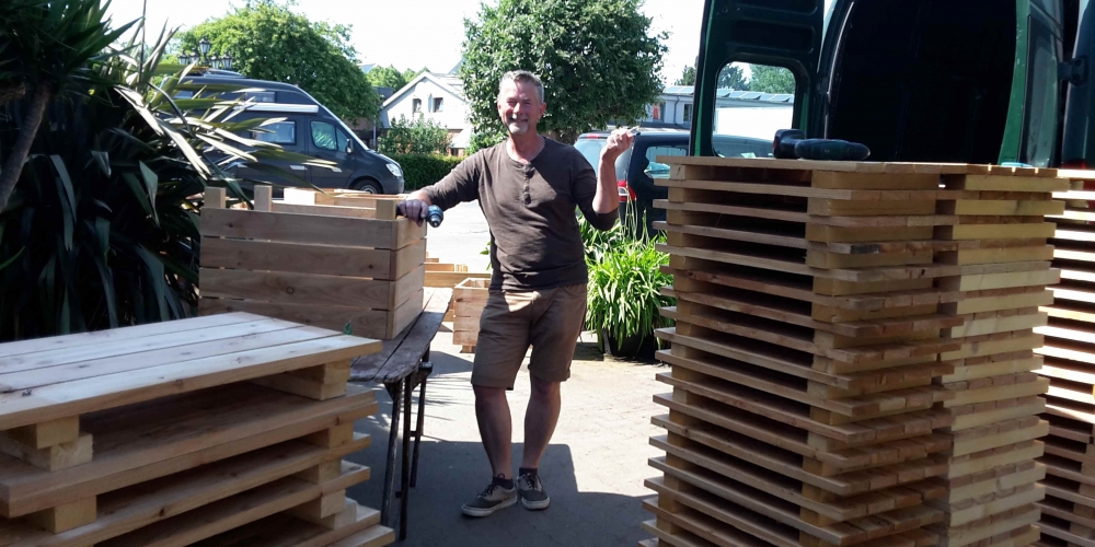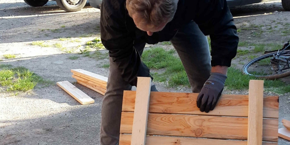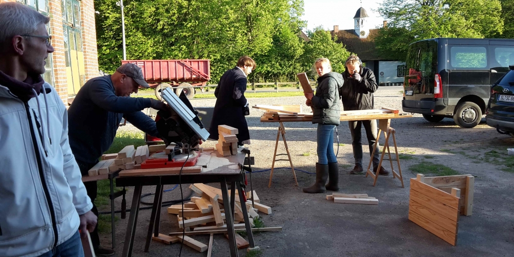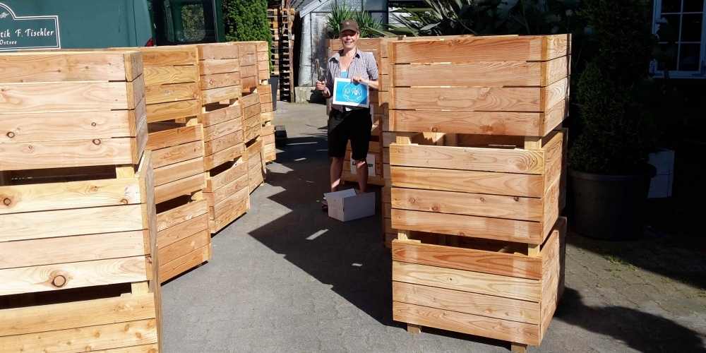 Die Kübel werden zusammengeschraubt, die Werkstatt wird vom Schloß Gelting zur Verfügung gestellt. Die Latten sponserte Dachdeckerei Fritz, Inh. Andreas Marose, 28. Mai