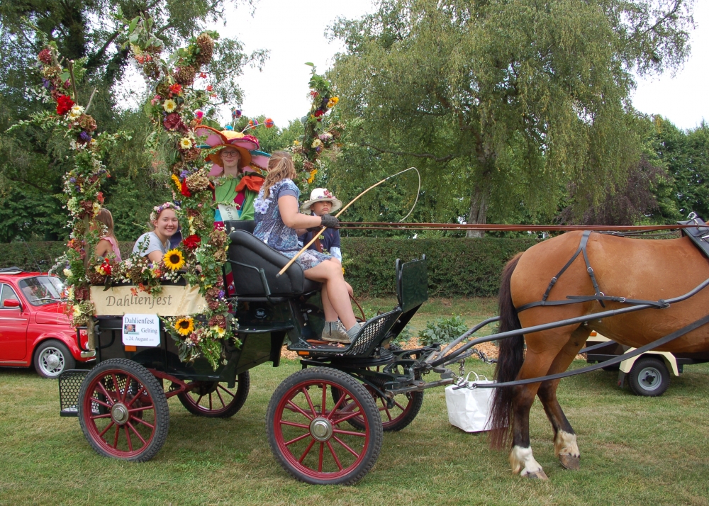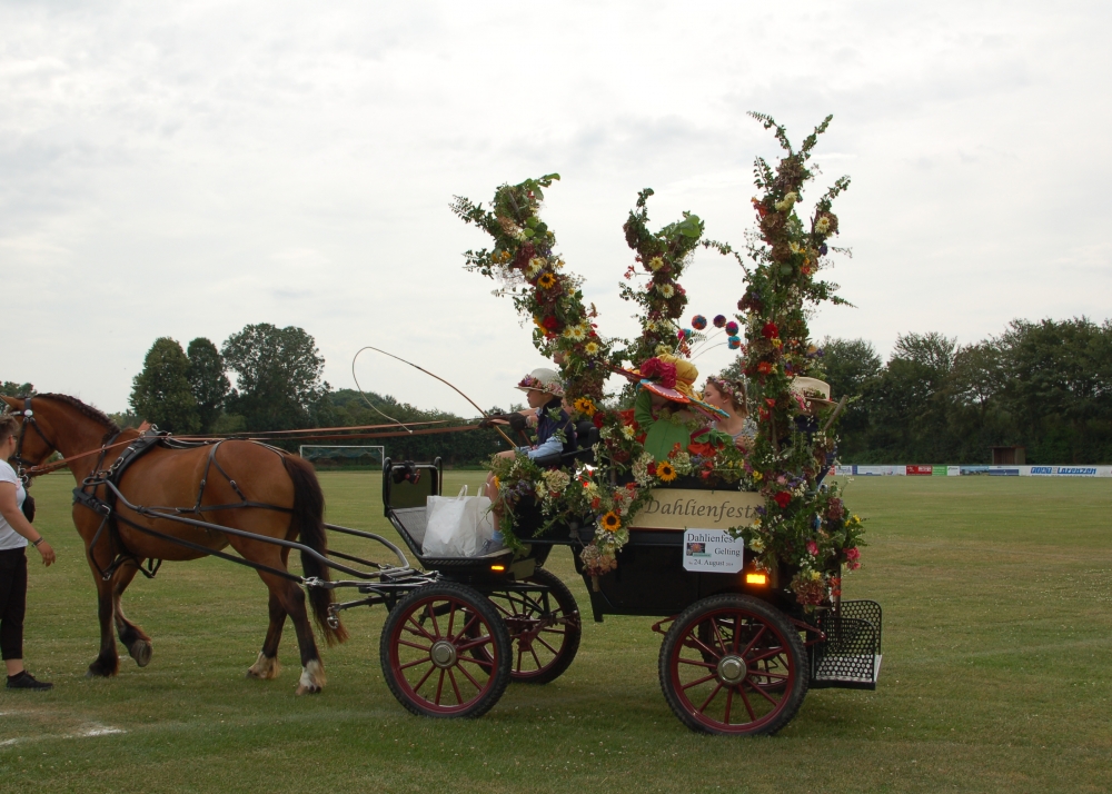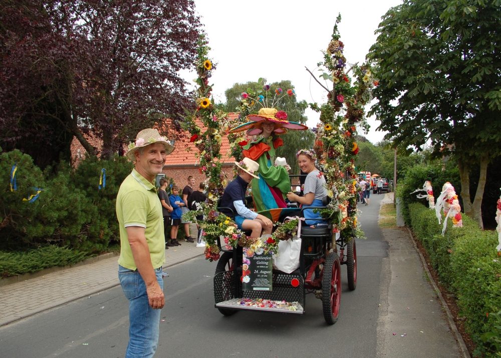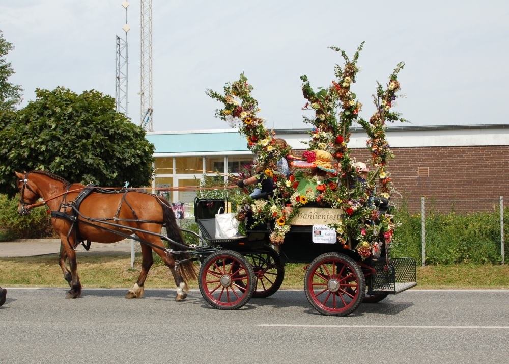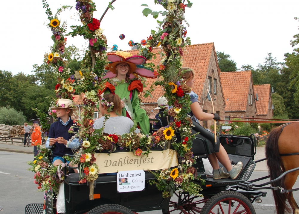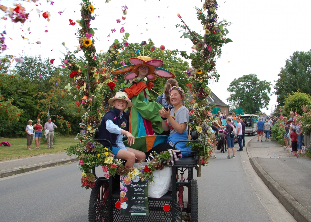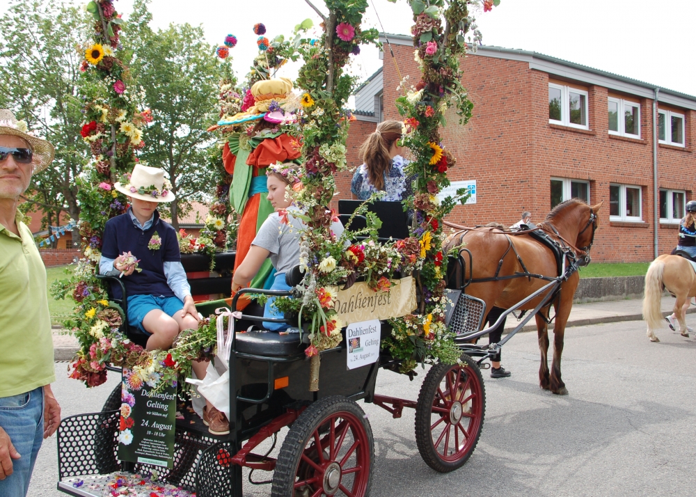 Das Dahlienfest beteiligt sich am Festumzug der Geltinger Tage. Die Kutsche ist gesponsert von Mon Cheval Reiterhof in Rabenholz, der Blumenschmuck und Hut des Georginchens ist erstellt und gesponsert von Gärtnerei F. Tischler. Das Kleid des Georginchens nähte und sponserte Bosedo Bodo Hansen. Die Kinder auf der Kutsche hatten großen Spaß beim Blütenblätter streuen, 20. Juli