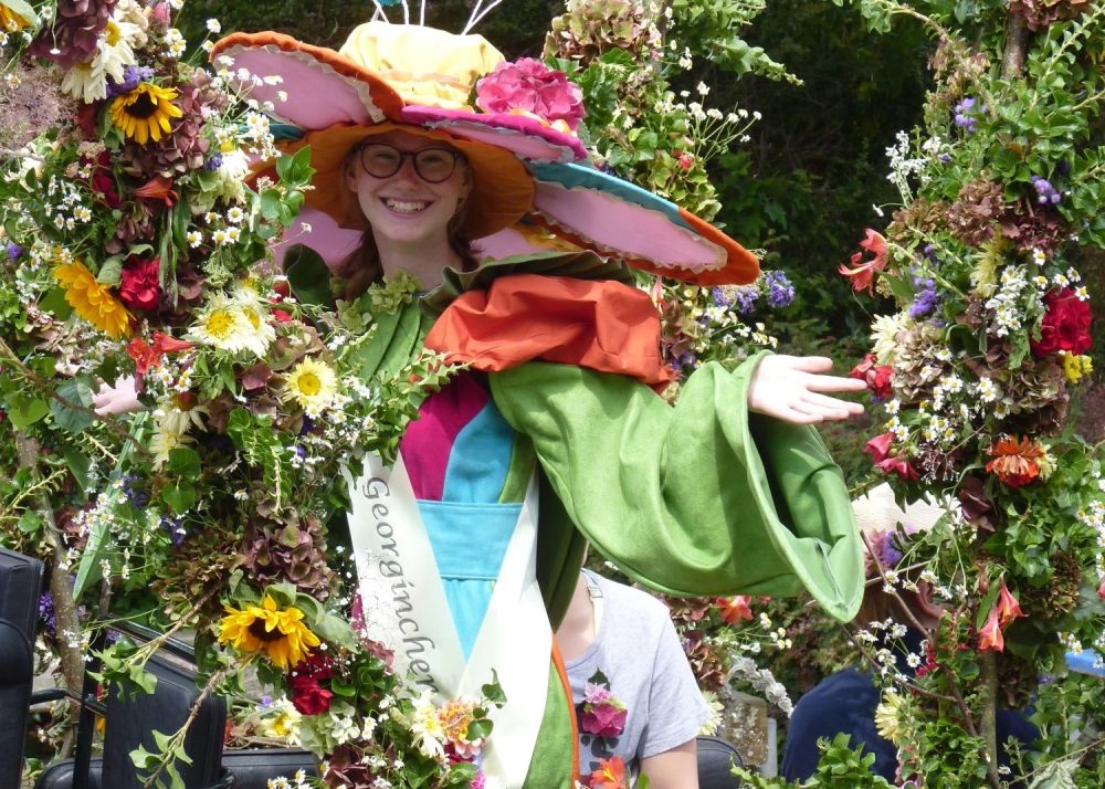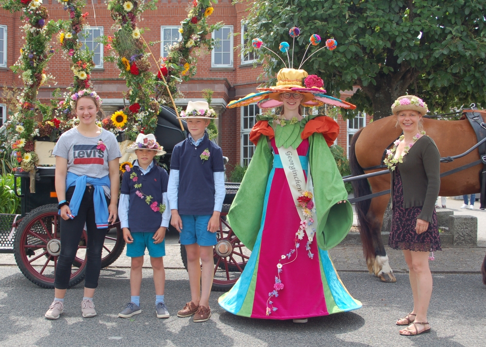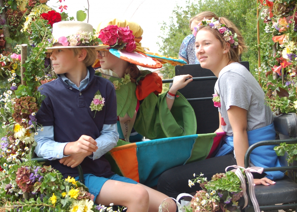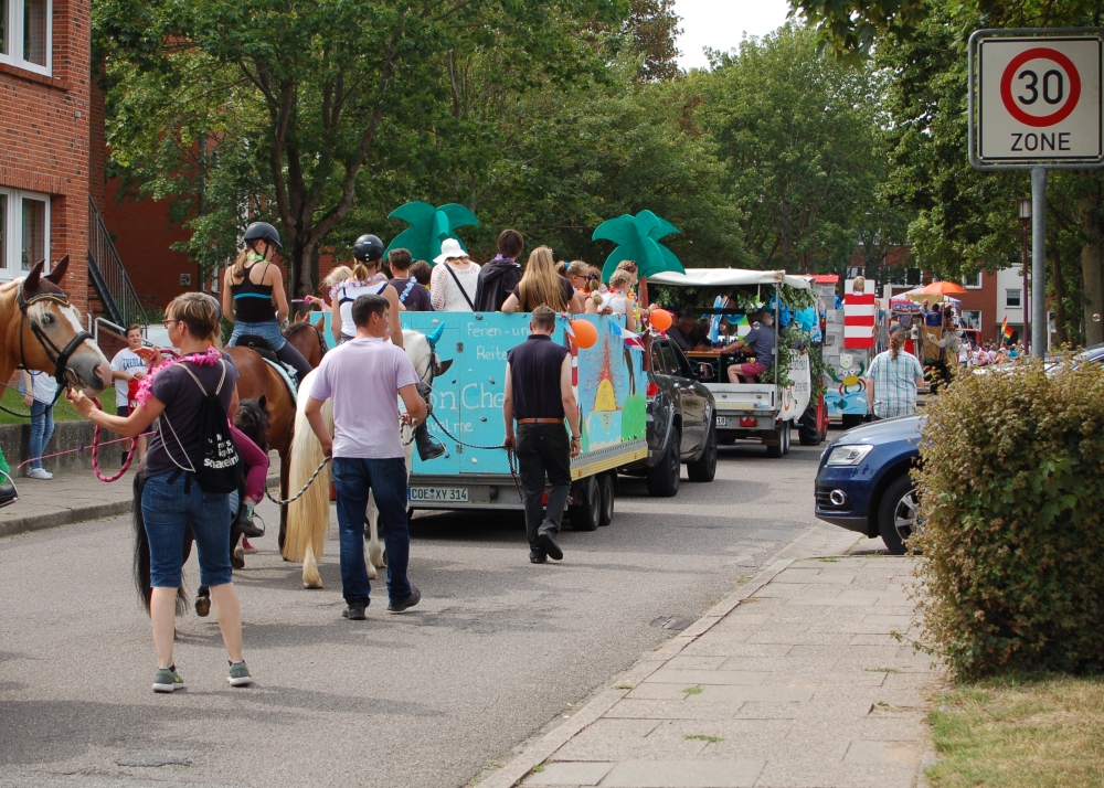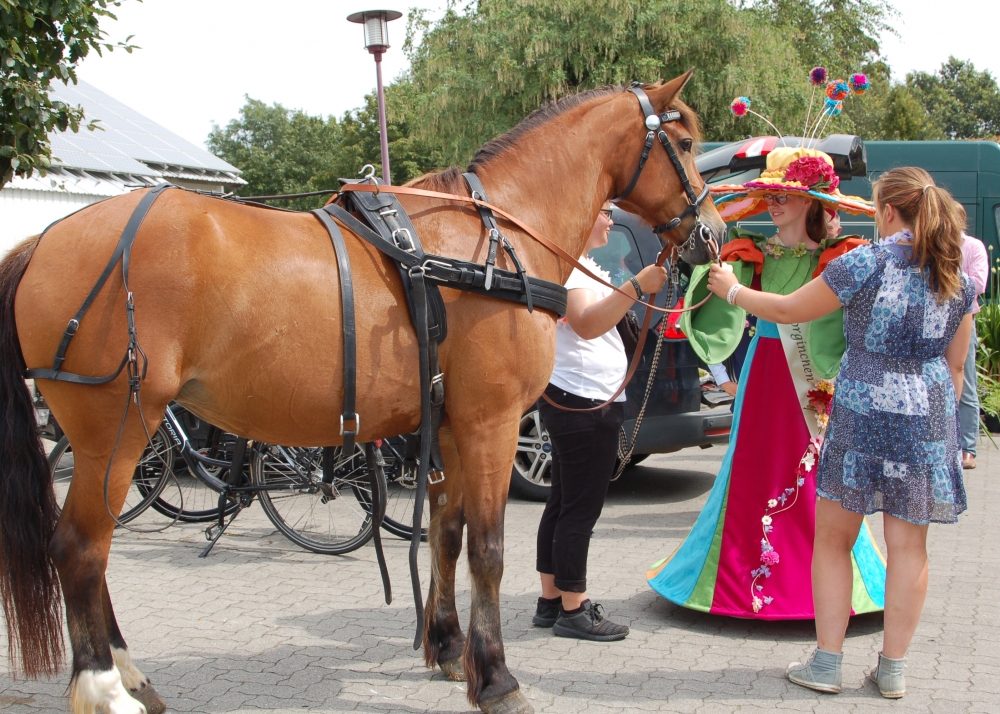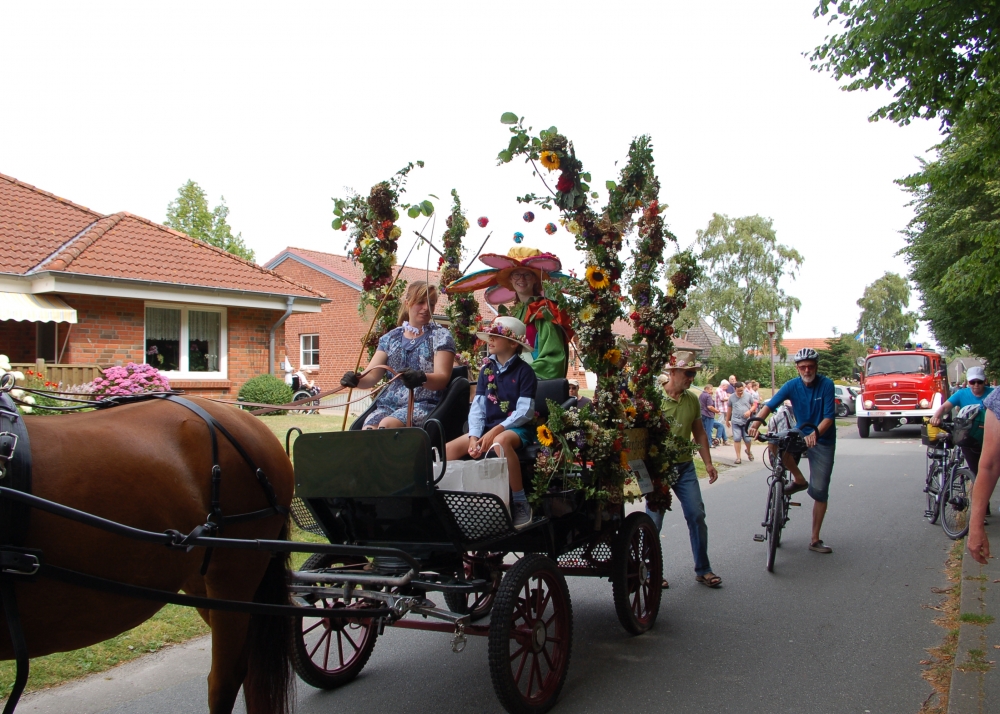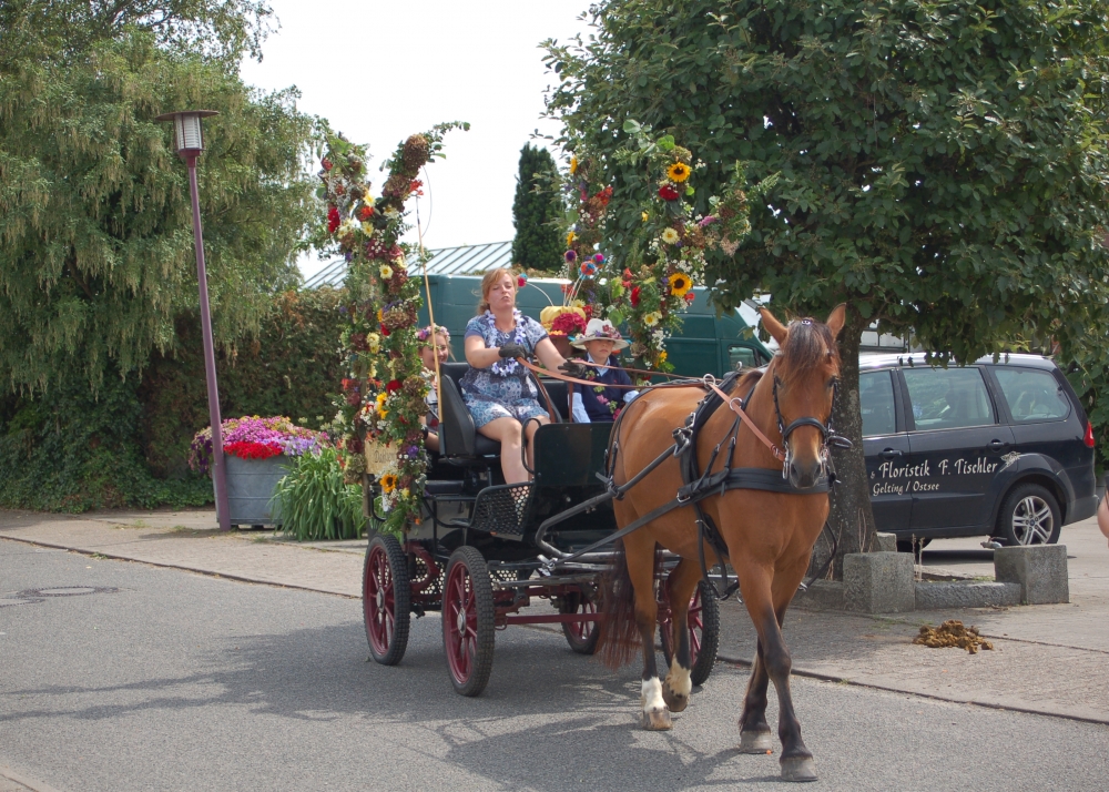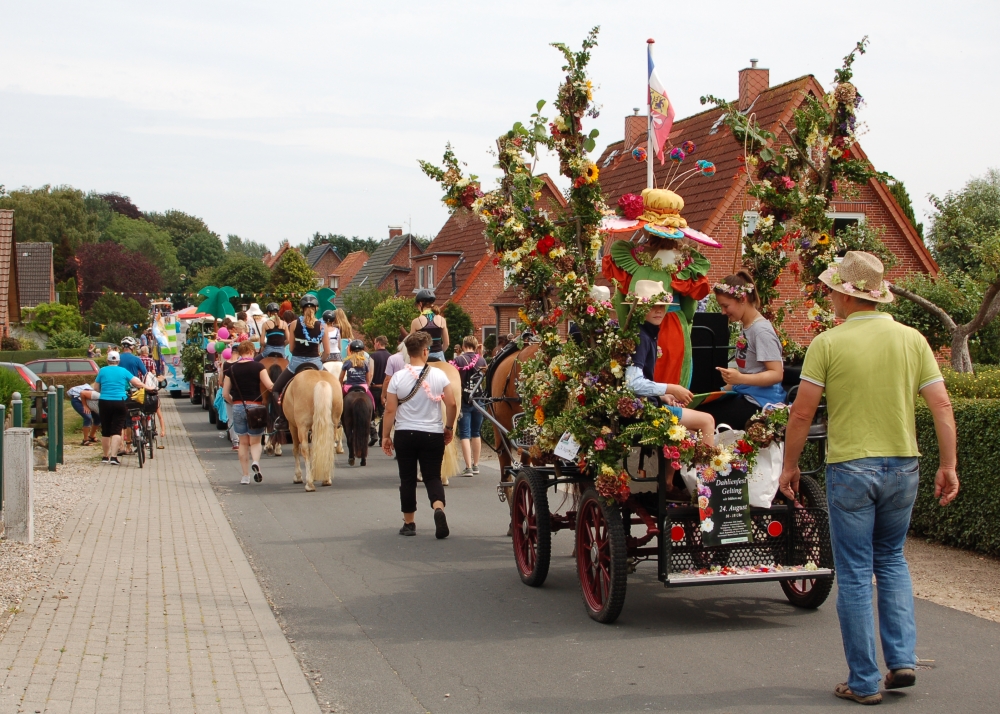 Das Dahlienfest beteiligt sich am Festumzug der Geltinger Tage. Die Kutsche ist gesponsert von Mon Cheval Reiterhof in Rabenholz, der Blumenschmuck und Hut des Georginchens ist erstellt und gesponsert von Gärtnerei F. Tischler. Das Kleid des Georginchens nähte und sponserte Bosedo Bodo Hansen. Die Kinder auf der Kutsche hatten großen Spaß beim Blütenblätter streuen, 20. Juli