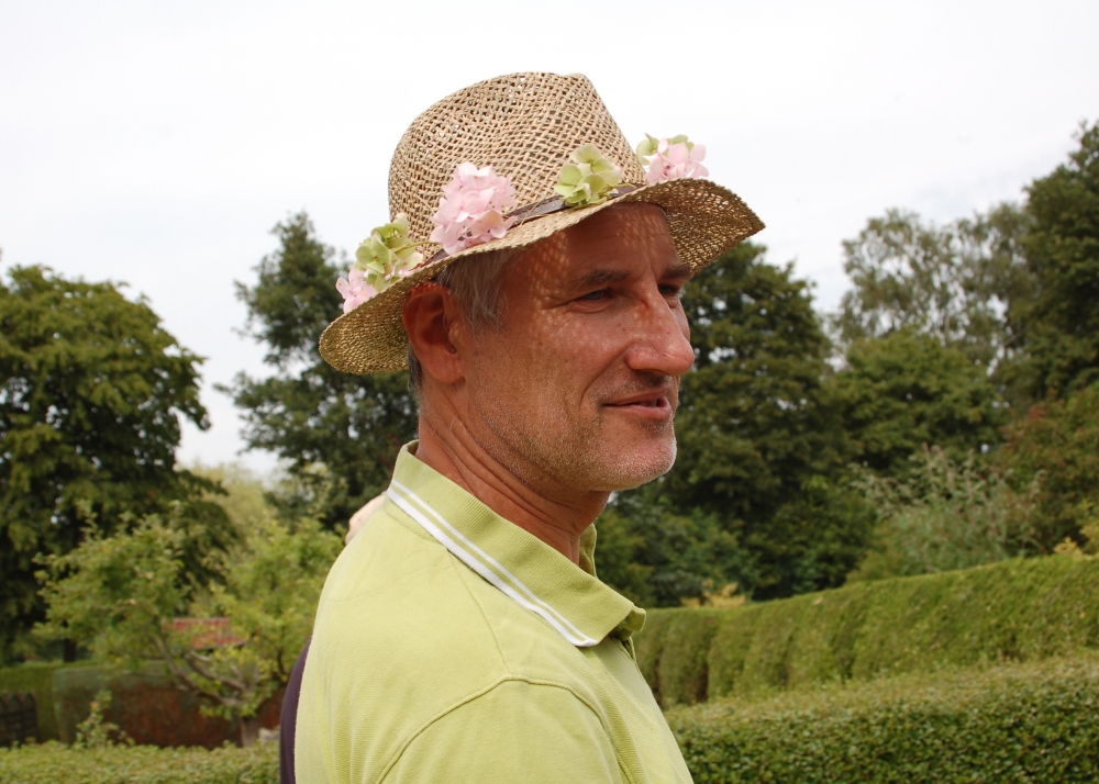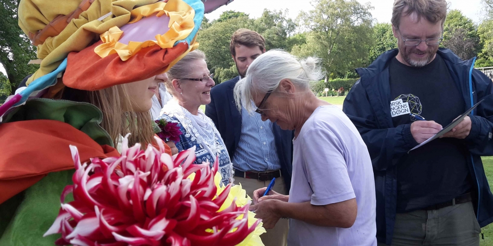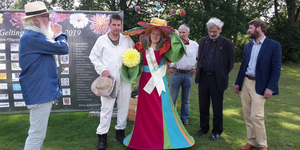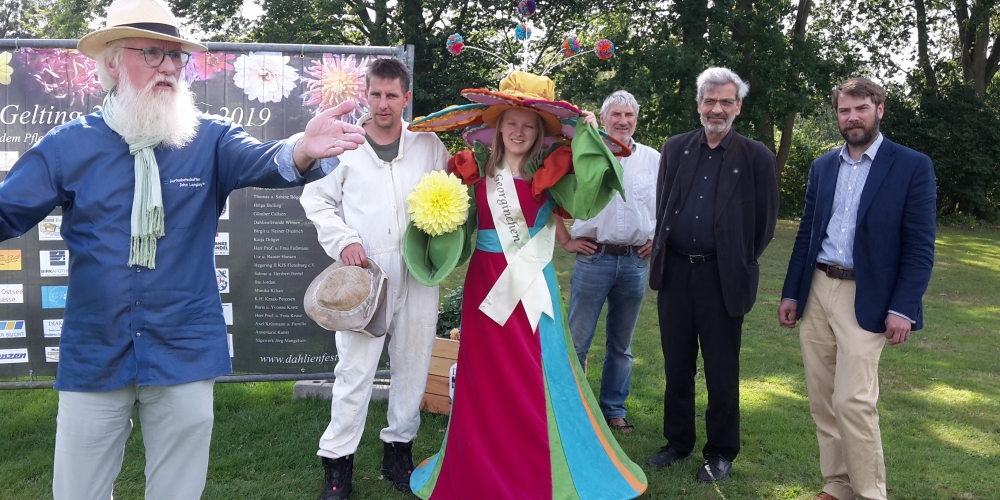 Pressetermin im Bürgerpark mit Gartenbotschafter John Langley®, Georgienchen, Imker Jens Husfeld, DahlienKomitee und Presse , SHZ , Wochenschau und Flensburgeravis, 8. August