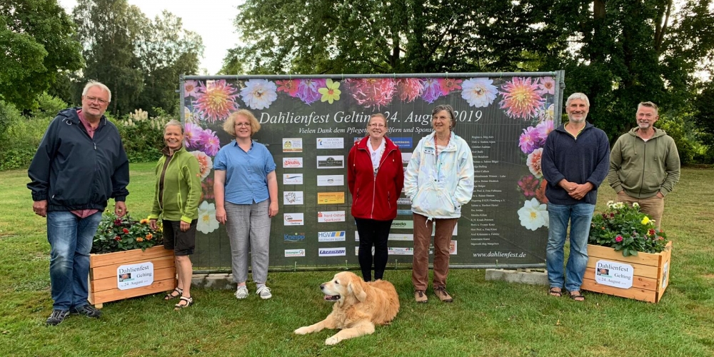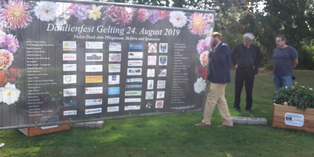 Das Dahlienkomitee präsentiert die Sponsorentafel und stellt diese im Bürgerpark auf, 2. August